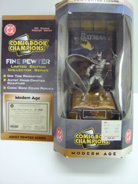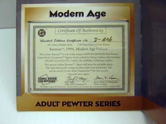 This beautiful Comic Book Champions is of the 1994 Batman! This is from the Modern Age Adult Pewter Edition. Never opened and is MNB. The limited Edition Certificate Number is D-406.DC Comics Premiere Series7.99 Troy Ounces of Fine Pewter. This Item comes with a C.O.A from Marvel. Please look at pictures for more details and information.