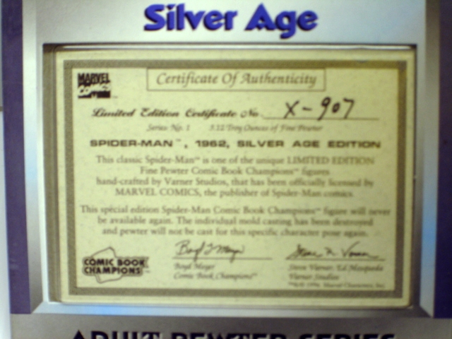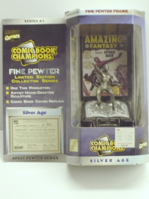 This beautiful Comic Book Champions is of The SPIDERMAN 1962! This is from the Silver Age Adult Pewter Edition. Never opened and is MNB.The limited Edition Certificate Number is x-907.Series No. 13.22 Troy Ounces of Fine PewterThis Item comes with a C.O.A from Marvel. Please look at picture for more details and information.