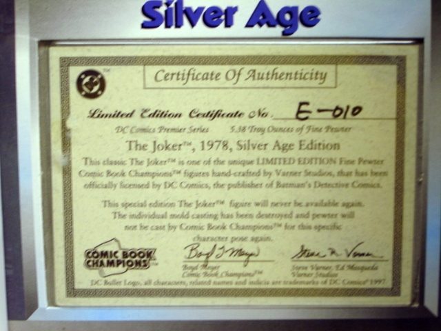 This beautiful Comic Book Champions is of The Joker 1978! This is from the Silver Age Adult Pewter Edition. Never opened and is MNB. The limited Edition Certificate Number is E-010. DC Comics Premiere Series5.38 Troy Ounces of Fine PewterThis Item comes with a C.O.A from Marvel. Please look at picture for more details and information.