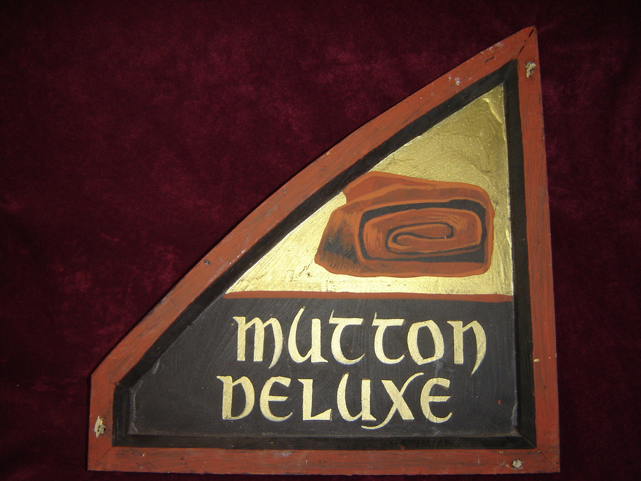The second wooden sign is red, black and gold in color and is approx. 13 1/4 x 13 3/4 inches and it has a picture of a piece of meat on it with Mutton Deluxe written underneath it.