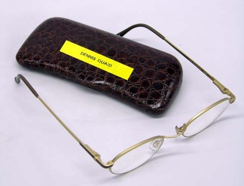 Hugh’s (DENNIS QUAID)Gold Framed Prescription Glasses This pair of gold metal framed glasses with clear glass lenses tailored for a mild prescription. The glasses come with a dark brown, faux alligator skin carrying case with a yellow tape label with the name “Dennis Quaid” printed in black lettering. This Item comes with a C.O.A. from Premiere Props.