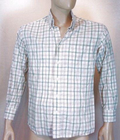 The shirt is white with red and green check stripes.