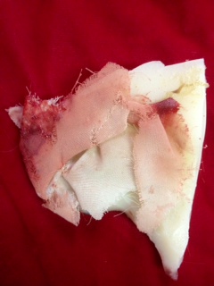 This is a piece of BODY from the Car Scene in SAW: The Final Chapter (SAW 3D). We saw Evan (played by Chester Bennington) in this famous car scene! Dan was behind Evan’s car in this scene…Dan is the man that had hooks attached to his body! This is a bloody piece of Dan’s body flesh!