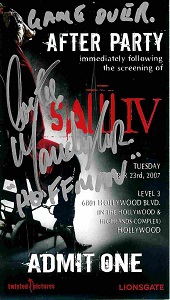 This ticket was for a party after the 1st screening of SAW IV worldwide! This ticket allowed you to go to a special “Invitation Only” party celebratingthe release of Saw IV!The ticket has all of the information on it about when and where the party would be held and has a picture of “Brenda” the Pig Mask woman!Costas Mandylor autographed the front of this awesome ticket with these words…”Costas Mandylor”, “Game Over”, and “Hoffman”.As you know, “Game Over” is the two famous words he says at the end of Saw IV.Coatas Mandylor signed (with a silver Sharpie pen) this ticket exclusively for Raybin Management in a private signing session.This very rare and exclusive “Invitation Only” party ticket was for the party after the Hollywood Screening of Saw IV held on October 23, 2007. The party was held at Level 3 near the Manns Chinese Theatre where the premiere screening was shown.The only invites were cast, crew & friends!This 3 1/2″ x 6″ ticket is printed in full color on heavy ticket stock.This is extremely rare and came directly from Raybin Management,official seller of all Saw IV merchandise!