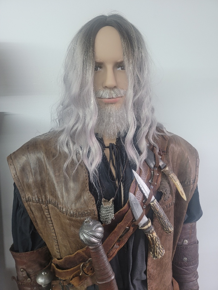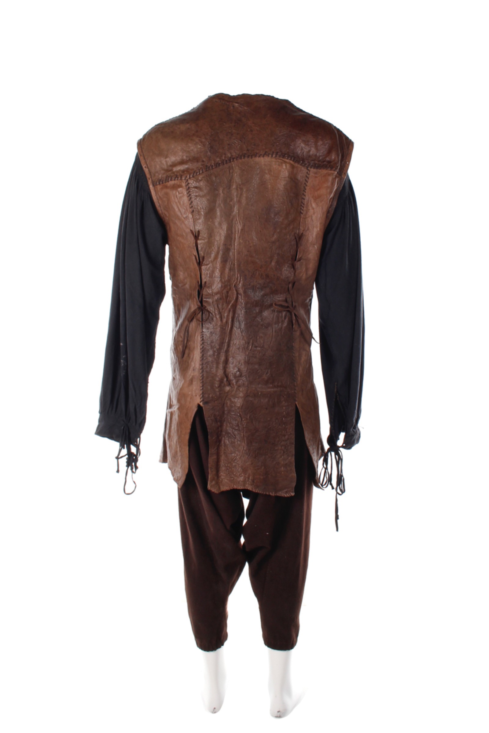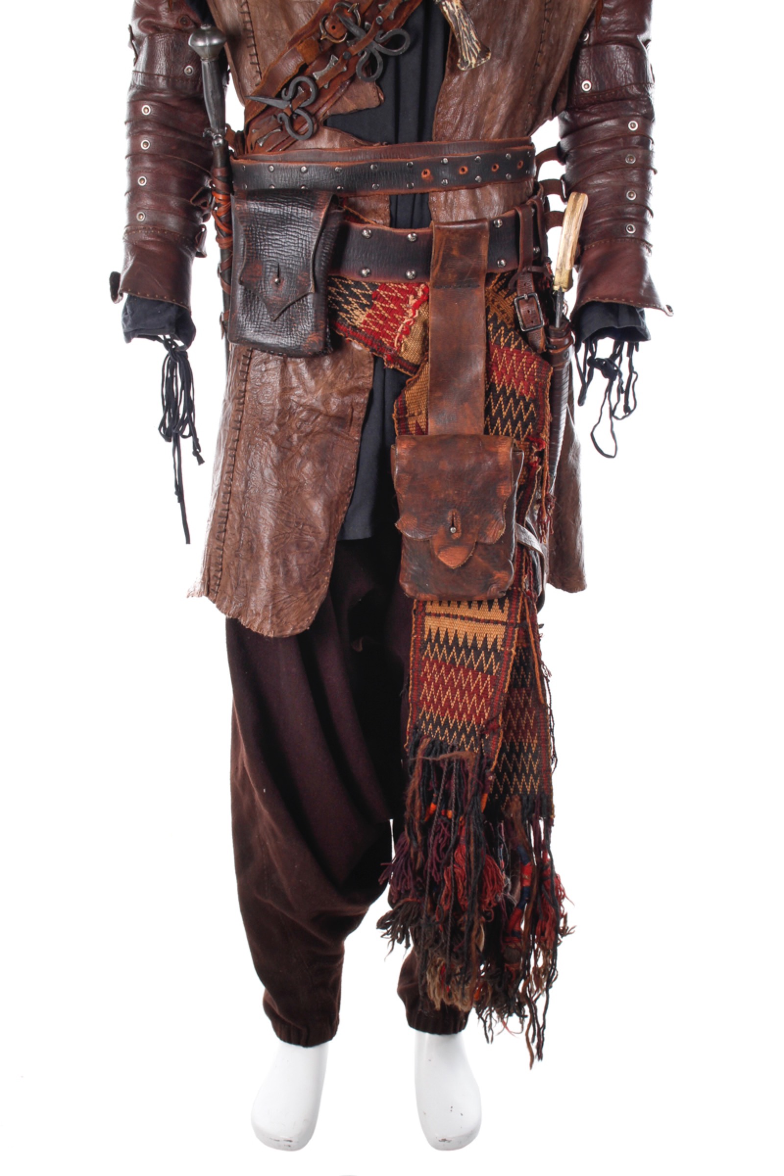 This costume includes a tunic, leather vest, pants, waist wrap, long overcoat, leather arm gauntlets, gloves, boots, and weapon belts.
