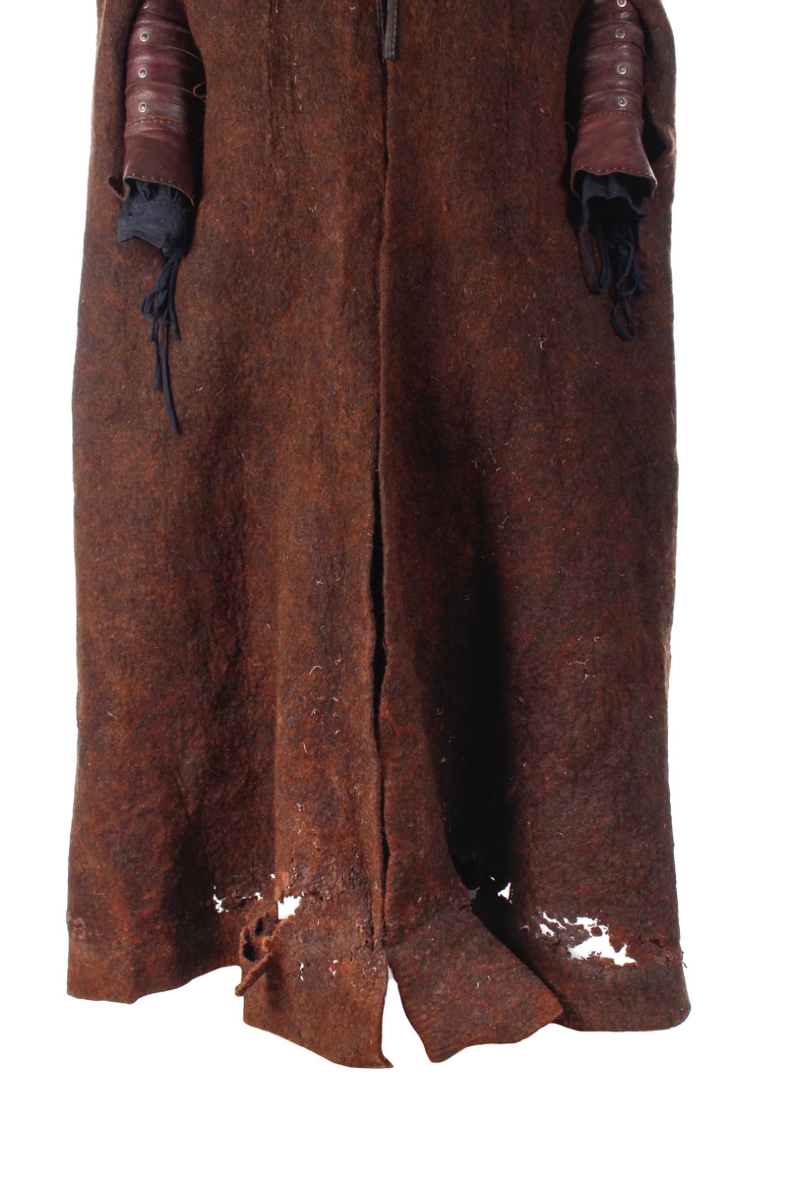 The long overcoat is made of very dense wool and is heavily distressed by production, particularly on the bottom of the coat.