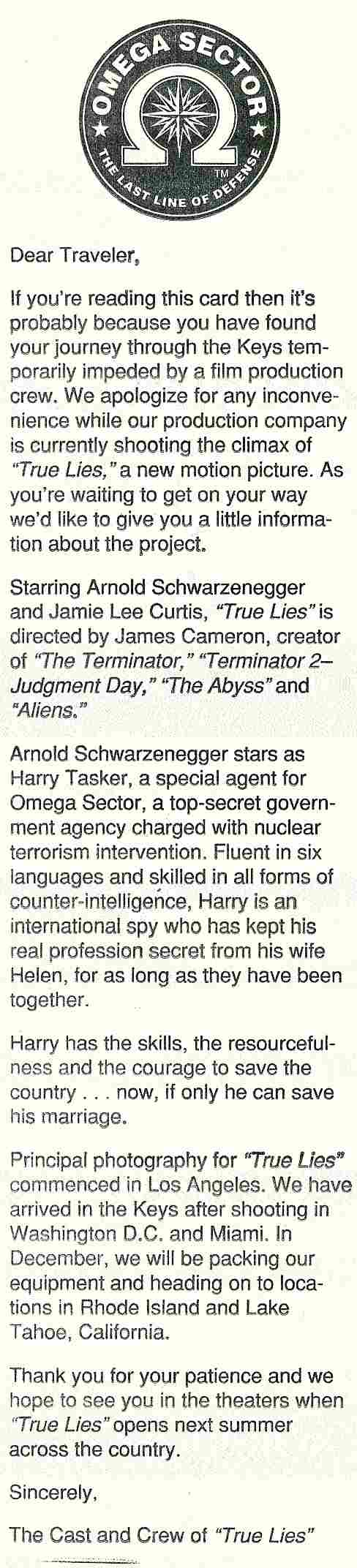 If you are reading this card then its probably because you have found your journey through the Keys temporarily impeded by a film production crew. We apologize for any inconvenience while our production company is currently shooting the climax of “True Lies”, a new motion picture. As you’re waiting to get on your way we’d like to give you a little information about the project Starring Arnold Schwarzenegger and Jamie Lee Curtis, “True Lies directed by James Cameron, creator of “The Terminator,” “Terminator 2 – Judgement Day,” “The Abyss”, “Aliens”. Arnold Schwarzenegger stars as Harry Tasker, a special agent for Omega Sector, a top-secret government agency charged with nuclear terrorism intervention. Fluent in six languages and skilled in all forms of counter-intelligence, Harry is an international spy who has kept his real profession secret from his wife Helen, for as long as they have been together. Harry has the skills, the resourcefullness and the courage to save the country . . . now, if only he can save his marriage. Principle photography for “True Lies commenced in Los Angeles. We have arrived in the Keys after shooting in Washington D.C. and Miami. In December, we will be packing our equipment and heading on to locations in Rhode Island and Lake Tahoe, California Thank you for your patience and we hope to see you in the theaters when “True Liesopens next summer across the country. Sincerely, The Cast and Crew of “True Lies”.